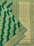 This bottle-green Banarasi Kadwa Weave Silk Saree showcases intricate gold zari and meenakari floral laheriya patterns throughout, accompanied by a matching self floral border and brocade pallu. The saree is completed with a self plain blouse featuring a zari border.