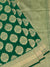 This elegant bottle-green banarasi silk saree is adorned with a detailed gold zari weave and meenakari floral buttis throughout. It features a matching self brocade border and pallu, paired with a simple blouse that includes a coordinating border, making it a graceful choice for festive wear.