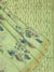 The chanderi cotton saree features a unique floral print, a small brocade border with gold zari accents, and a printed pallu with leaf designs. The saree is a stunning pista-green colour and comes with a self blouse.