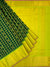 Gadwal pattu saree features a thread weave with gold zari checks pattern and floral buttis all over. The bottle-green color is enhanced by a contrasting brocade border and pallu. The blouse is plain with a border in a contrasting color.