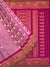 Gadwal pattu saree is adorned with intricate gold zari and thread floral buttis throughout its weave. The contrast floral border and pallu add a touch of elegance to the light-pink color. The blouse features contrasting floral buttis with a border, completing the stunning look.