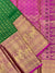 This Kanjeevaram silk saree features a beautiful geometric design with golden zari accents and delicate floral buttis throughout. The bottle-green colour is complemented by a contrasting animal motif border and brocade pallu. The blouse is plain with a stunning zari border to complete the look.