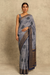 Maheshwari cotton saree boasts a design featuring a stunning all over floral block print on the body, accented by a contrasting zari floral border and jute pallu. Its beautiful blue colour is complemented by a self geometrical pattern with a zari border on the blouse.