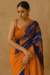 This Organza Saree features a vibrant multi-color brush paint pattern print all over, complemented by a plain orange border. It also comes with a self brush paint printed blouse for a complete look.