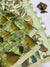 This Organza Printed Saree features an all-over checked pattern and a floral print in a complementary Pastel-Green color. The saree is accented with a small zari border and is paired with a self-printed silk blouse.