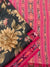 This Tussore printed silk saree showcases an all over floral printed in multiple colors, accented with a contrasting ikat border and pallu. The color of the saree is a bold black, while the blouse is designed with a contrast plain style and border.