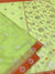 This Lemon-Green Zari Kota Saree showcases an elegant mix of silver zari and meenakari peacock motifs throughout the fabric, highlighted by a contrasting orange butta border and a floral jaal pallu. It includes an orange blouse embellished with floral buttas and a coordinating border for a harmonious look.