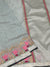 The Zari Kota Saree highlights delicate silver zari butta patterns. It presents a lovely contrast with pink lotus flowers arranged in elegant swan motifs along the border and includes a self brocade pallu in a captivating grey shade. The blouse complements the saree with matching contrasting buttas and border details.