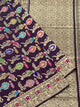 Banarasi silk saree boasts a stunning wine color and features intricate gold and silver zari floral buttis woven throughout the fabric. The saree is completed with a self brocade border and a floral pallu. The accompanying blouse is also self-colored with a border for a cohesive look.