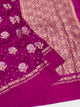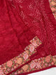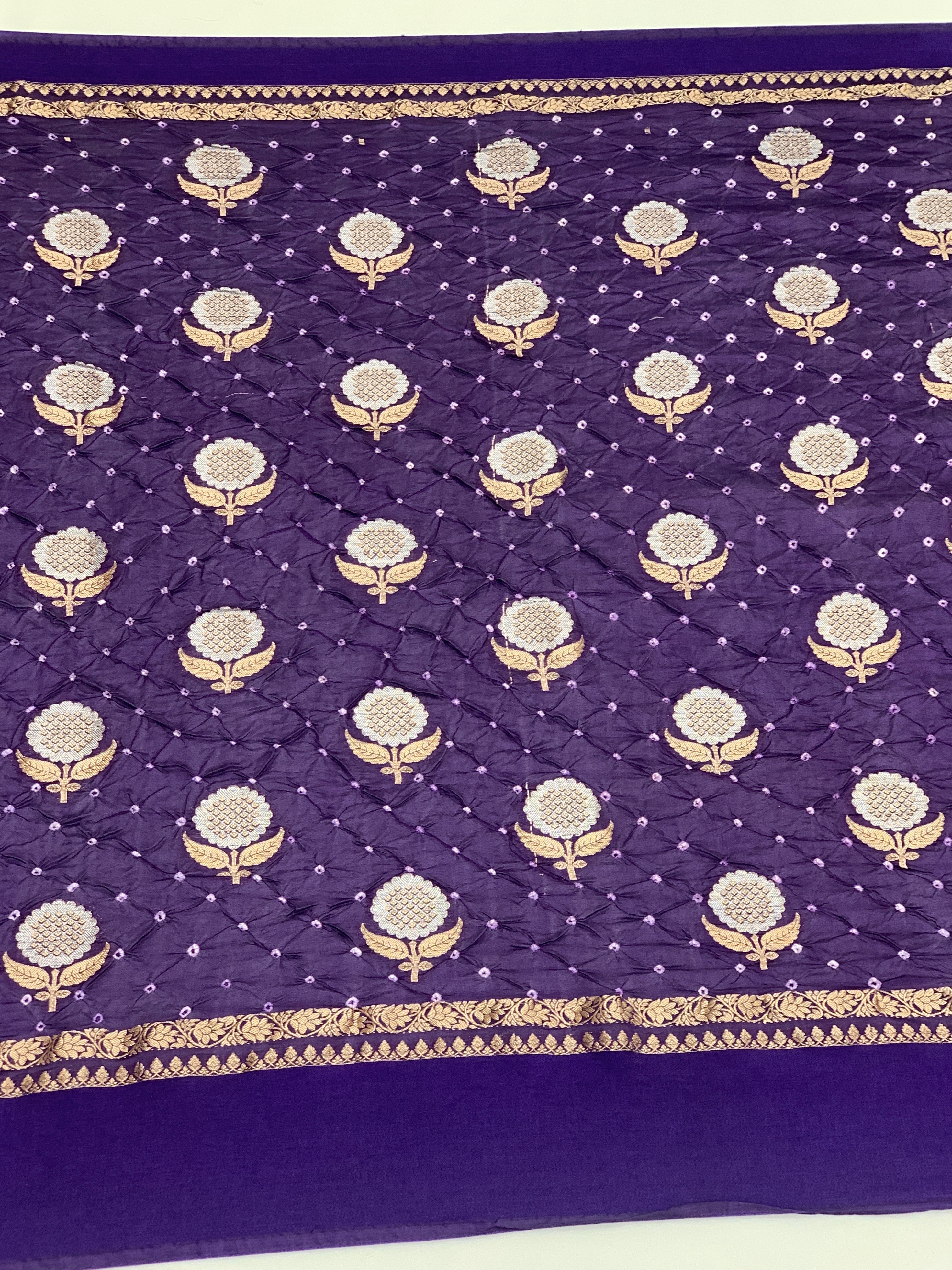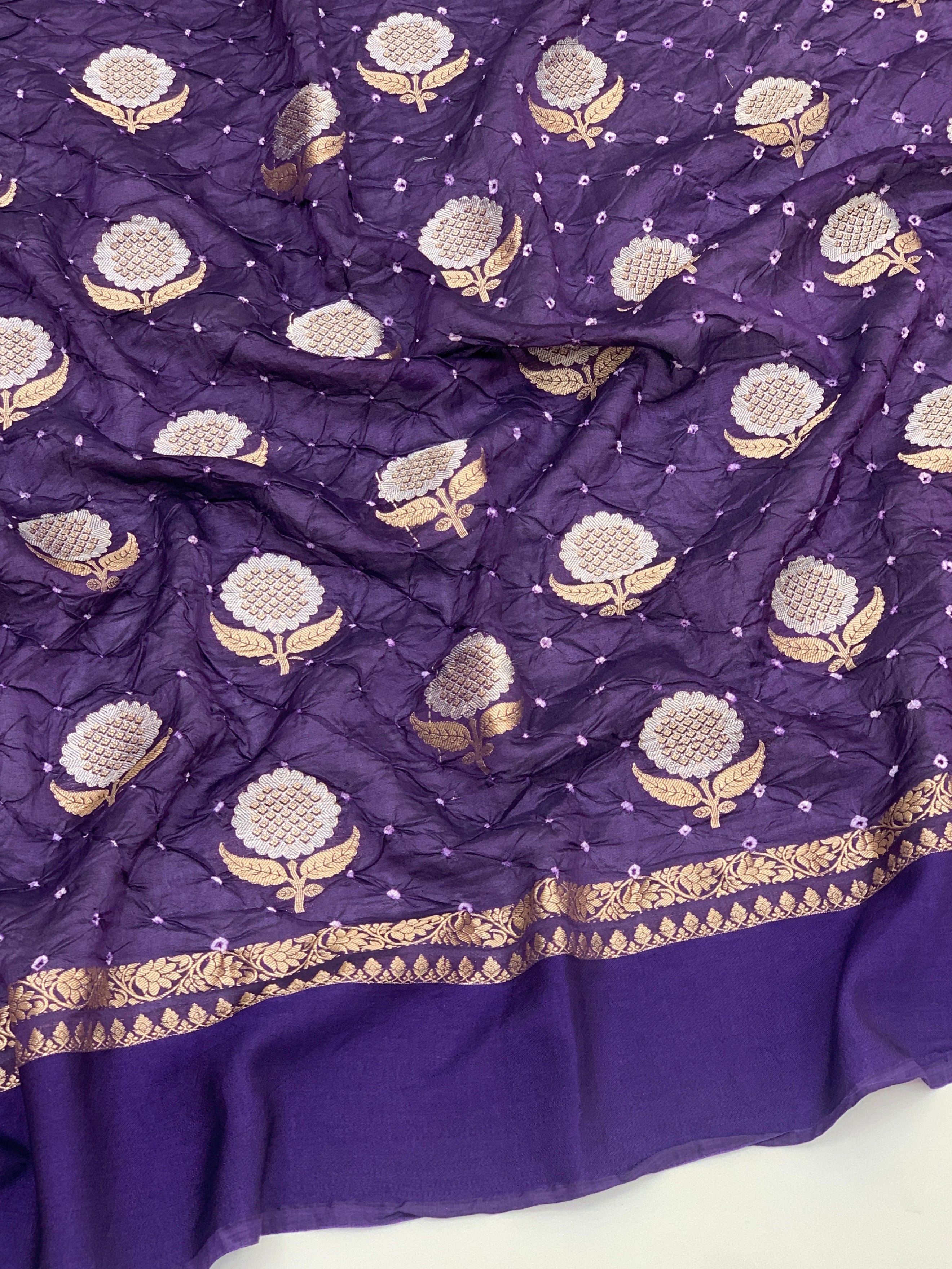 This exquisite Chanderi Silk Bandhani Saree in violet showcases traditional tie-dye bandhani work paired with lustrous silver and gold zari floral embellishments throughout. The pallu features ornate brocade detailing, while a delicate gold zari border frames the self-plain base. Complete with a matching brocade blouse adorned with coordinating borders.
