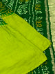 This mustard-colored Tussore Kota Bandhani Saree features a tie and dye bandhani pattern throughout the weave, along with a traditional gold zari kanjeevaram border and brocade pallu. The blouse also has a contrast tie and dye bandhani pattern with a border.