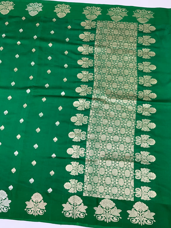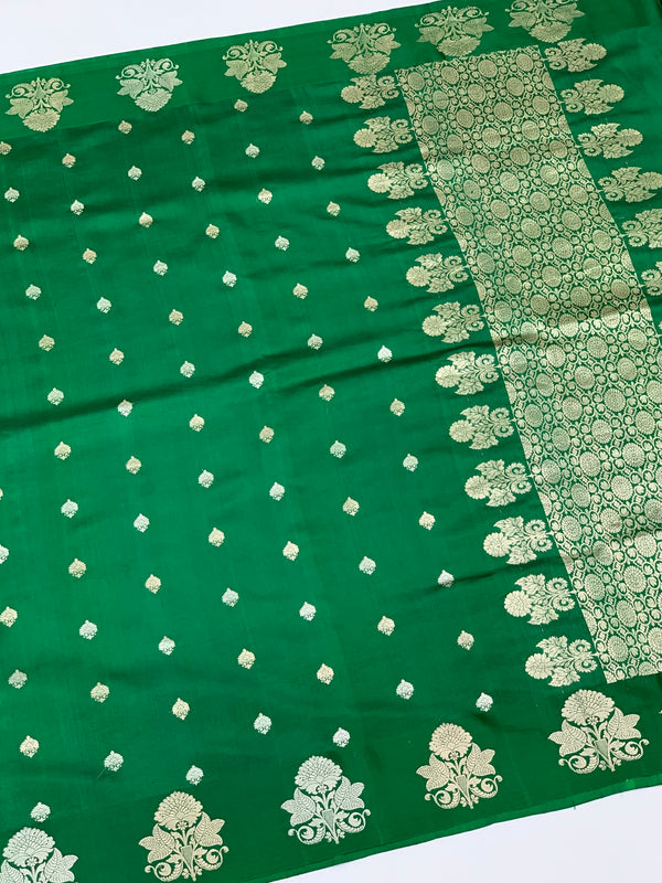 A classic bottle green chanderi silk saree featuring a luxurious scatter of gold and silver zari floral buttis. Finished with a self-design floral border and pallu, this drape includes a plain running blouse with border.