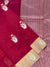 This stunning Chanderi silk saree boasts a intricate weave of gold and silver zari floral buttis, both on its body and border. The deep dark-red colour is complemented by a touch of navy-blue in the self plain blouse with zari border. Perfect for any occasion, this saree is a must-have for your wardrobe.