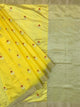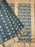 Chanderi silk saree features intricate gold and silver zari floral buttis throughout the saree, along with a contrasting brocade border and pallu. The saree is a stunning grey color, and the blouse is self designed with a border for a cohesive look.