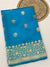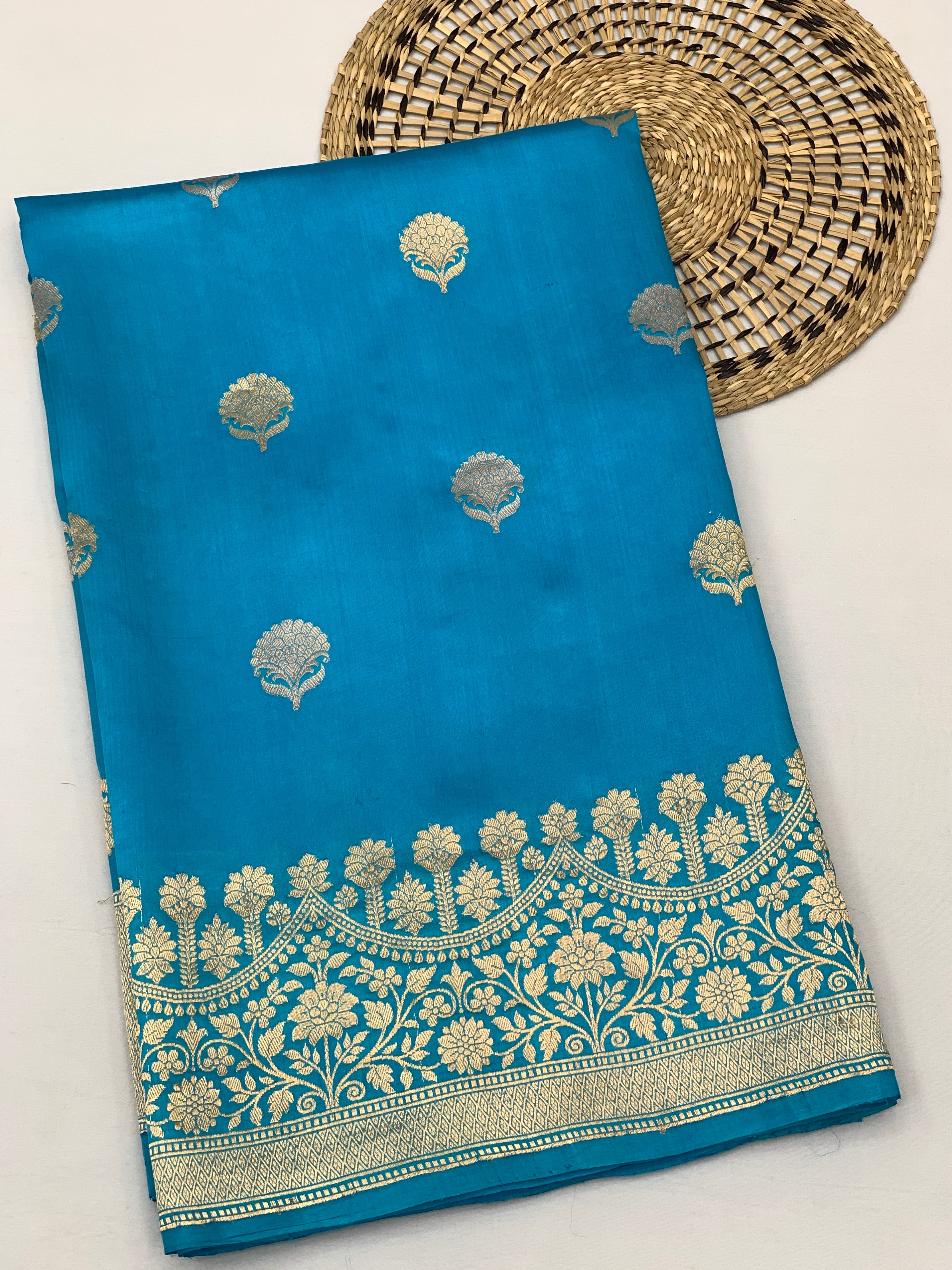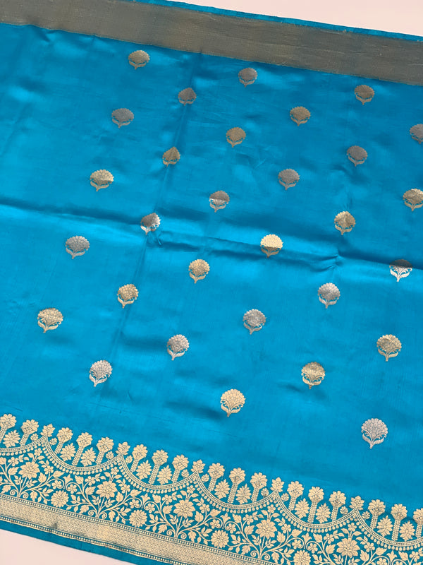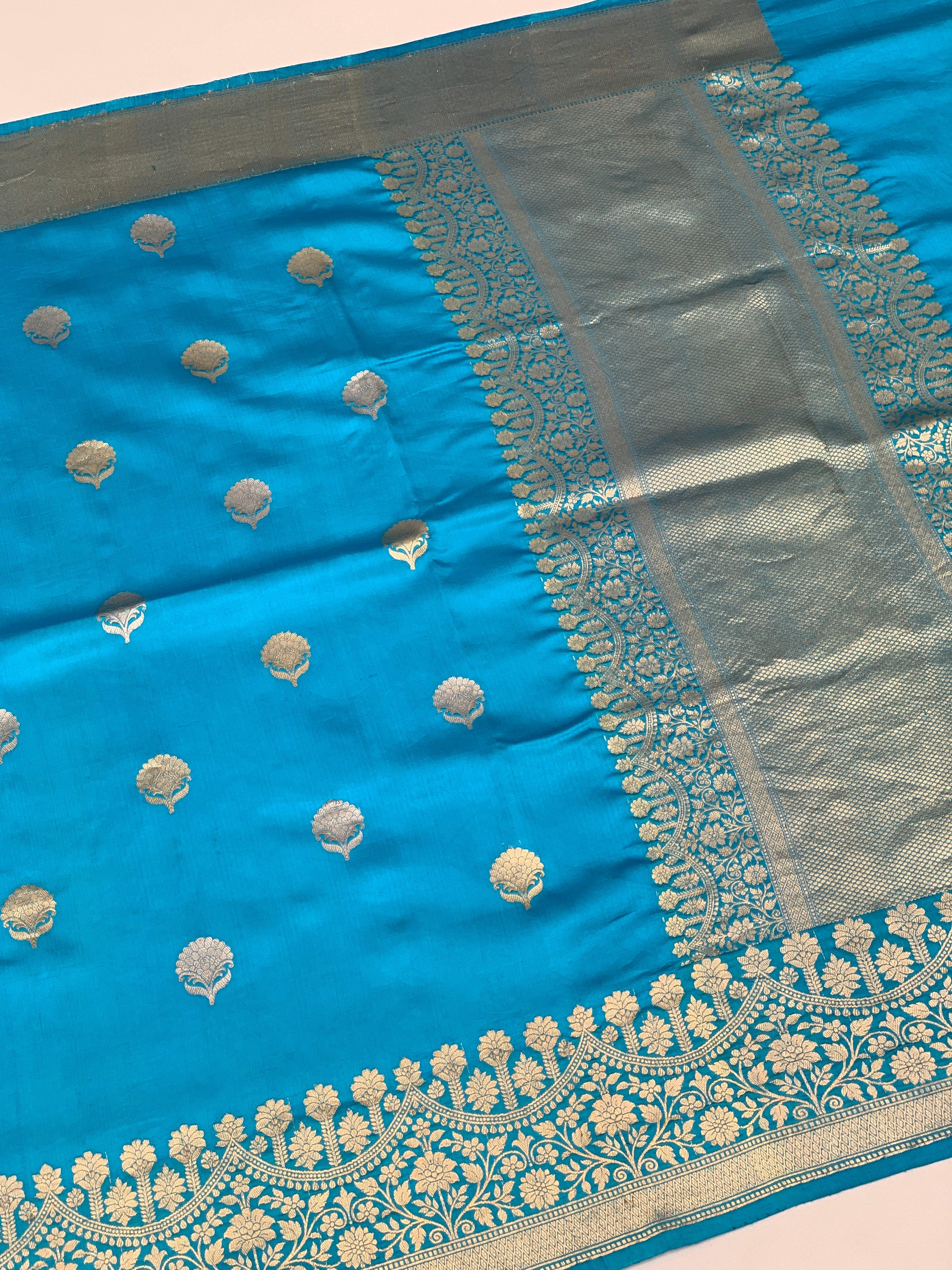 Discover the timeless appeal of Chanderi craftsmanship with this stunning light blue silk saree. Distinguishable by its lightweight texture and sheer gloss, the saree features an all-over weave of floral buttis crafted in both gold and silver zari. The design is anchored by a self-patterned floral border and culminates in a heavy, rich brocade pallu that offers a luxurious contrast. It comes with an unstitched, plain light blue blouse piece that includes a matching border for the sleeves.