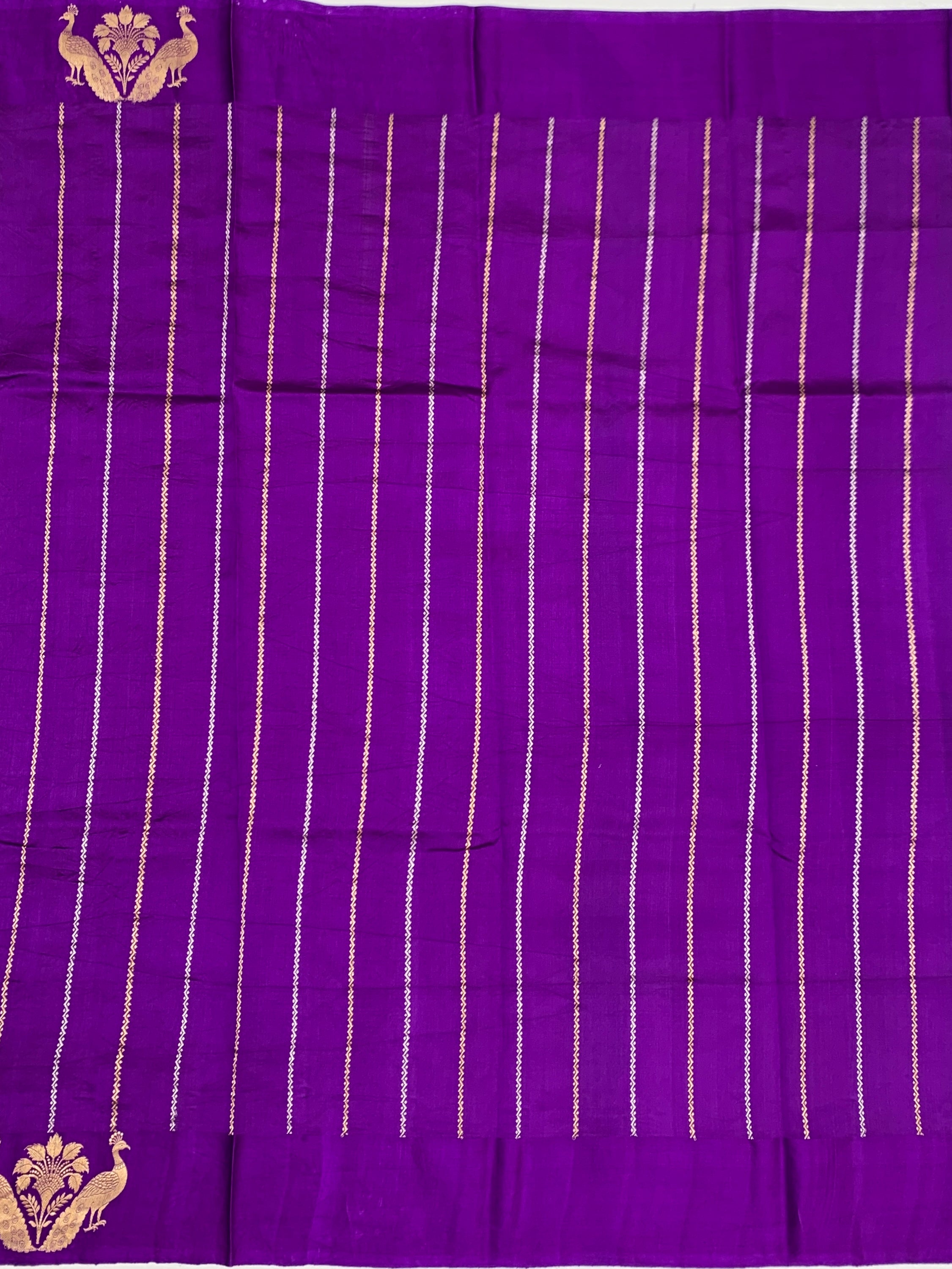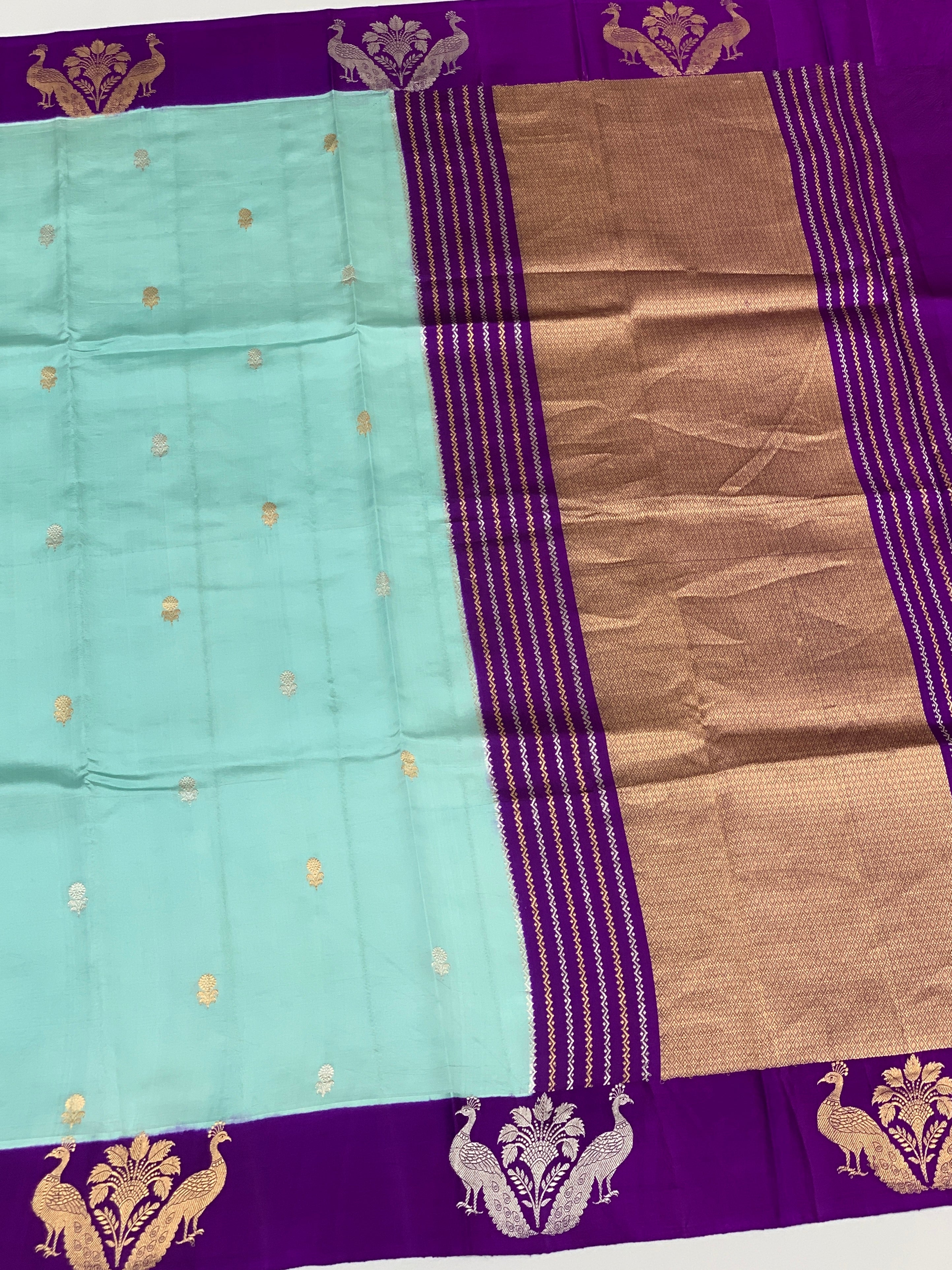 Elegant light-blue chanderi silk saree adorned with intricate gold and silver zari floral buttis throughout. Features a striking peacock motif border and richly embellished brocade pallu. Paired with a contrasting striped blouse that includes a decorative border for a polished finish.