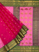 Chanderi silk saree boasts a stunning weave of gold, silver, and meenakari floral buttis throughout the fabric. Its contrasting brocade border and pallu add an elegant touch to the light-pink color. The blouse is also adorned with a border, completing the overall look of the saree.