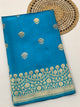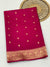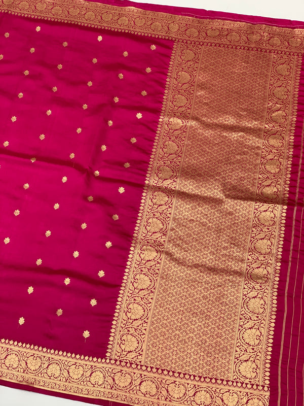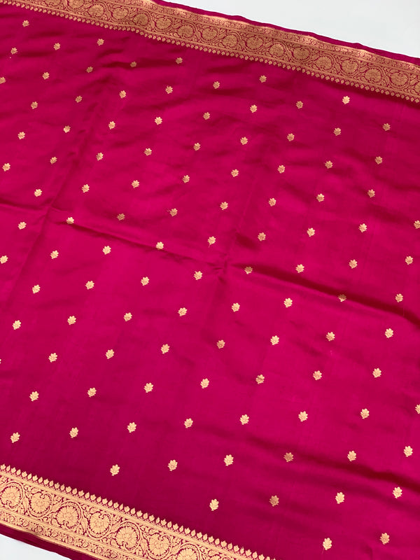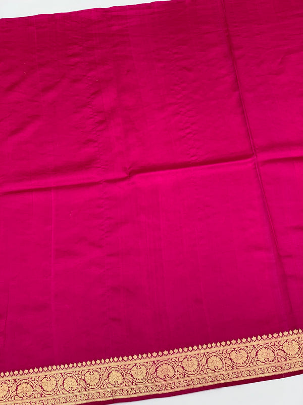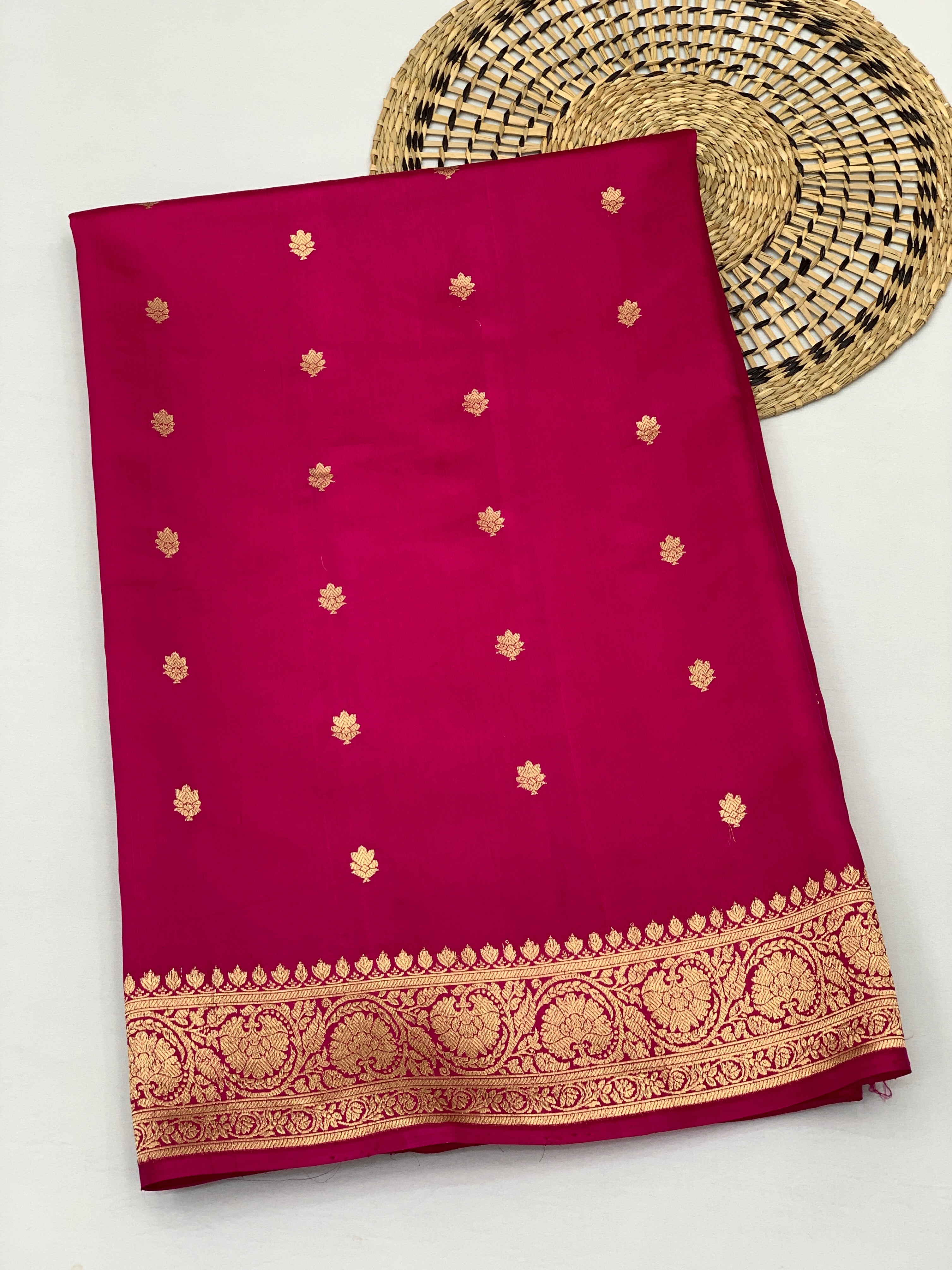 Radiate timeless grace in this exquisite Rani Pink Chanderi Silk saree. Known for its sheer texture and lightweight feel, this drape is adorned with intricate all-over gold zari floral buttis that shimmer against the vibrant fabric. The look is completed with a sophisticated self floral border and pallu. Accompanied by a plain self-colored blouse with a matching border, this saree is a perfect choice for festive occasions.