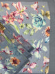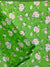 This chiffon saree features an all-over floral print, with a contrast plain border and a floral pallu. The color is a vibrant green and the blouse is plain.