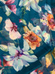 Chiffon floral printed saree features an all-over floral print, a contrasting plain border and a floral pallu. The color is a vibrant orange. It also includes a blouse made of self-crepe fabric with a thread weave and polka dot buttis.