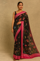 Maheshwari cotton saree boasts a design featuring a stunning all over floral block print on the body, accented by a contrasting zari floral border and jute pallu. Its beautiful blue colour is complemented by a self geometrical pattern with a zari border on the blouse.