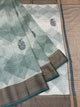 This Grey Maheshwari Cotton Saree features a sophisticated blend of geometrical patterns and floral motifs, The contrast antique thread floral zari border and pallu enhance its elegance, while the included blouse with subtle small floral prints completes the graceful ensemble.