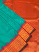 Gadwal pattu saree features a thread weave checks pattern with gold and silver zari, kairi buttis, and thread work floral buttis woven throughout the fabric. The saree also boasts a contrasting ganga-jamuna gap border and a brocade pallu. In a navy-blue color, the blouse is adorned with contrast floral buttis and a border.