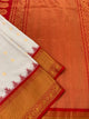 Gadwal Pattu Saree features a beautiful weave of gold zari floral buttis all over the saree, along with a contrasting brocade border and a paithani pallu. The main color of the saree is orange with a secondary color of pink, while the blouse has contrast floral buttis and a zari border.