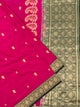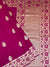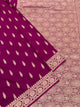 Mashru silk saree showcases stunning gold zari floral buttis, a self floral border, and a brocade pallu, all in a striking rani-pink color. The complementary blouse features self stripes for a polished touch.
