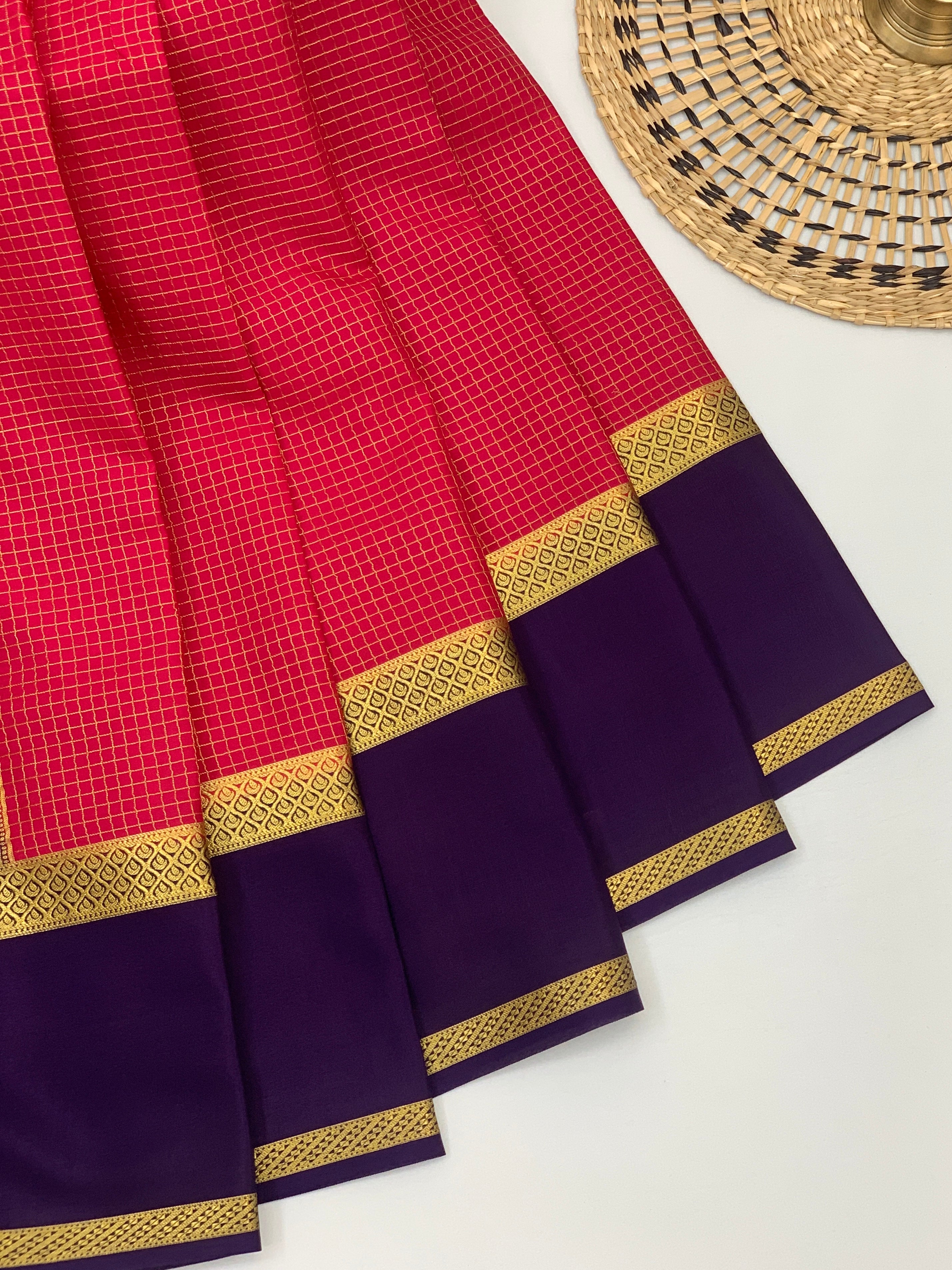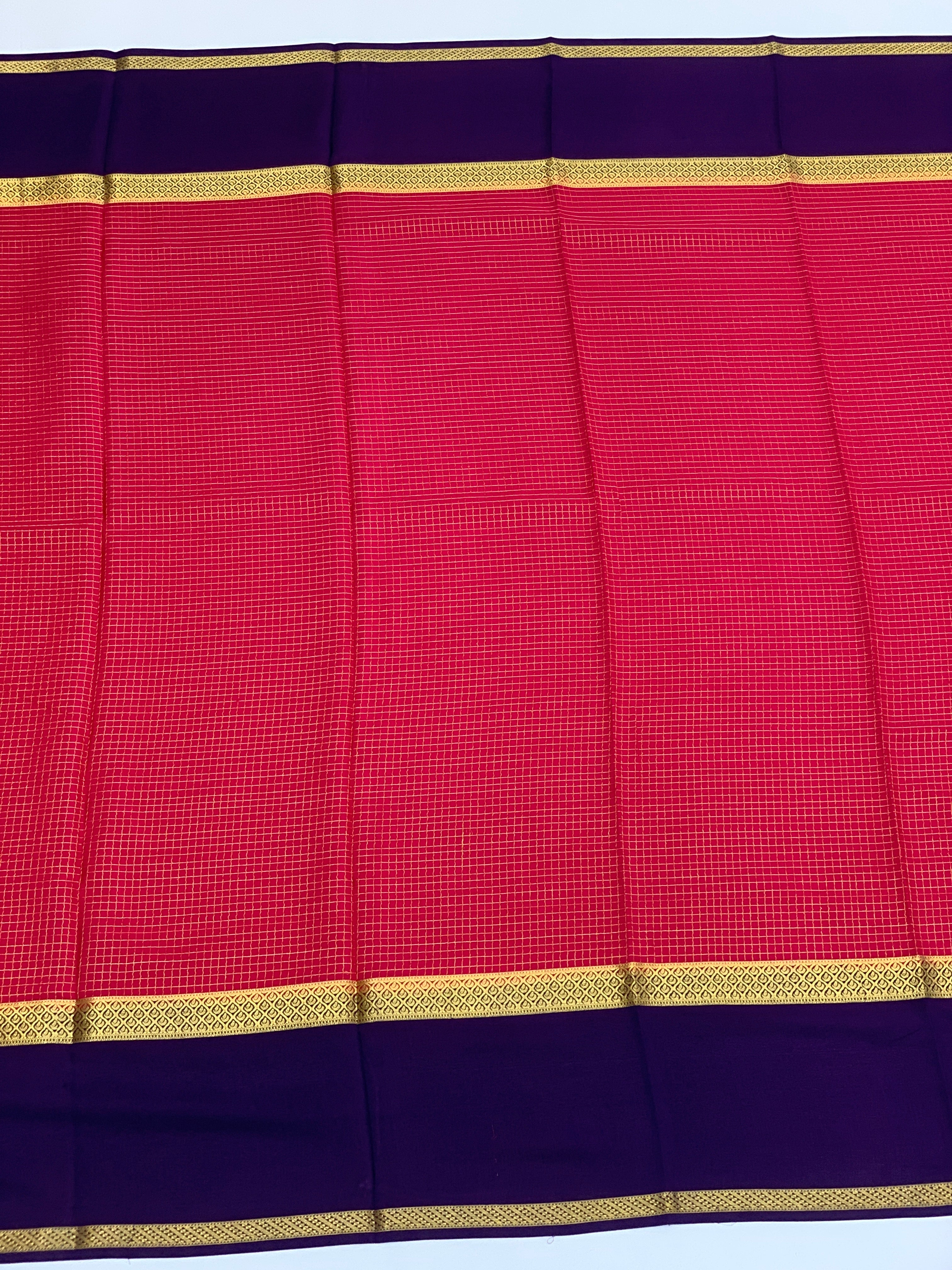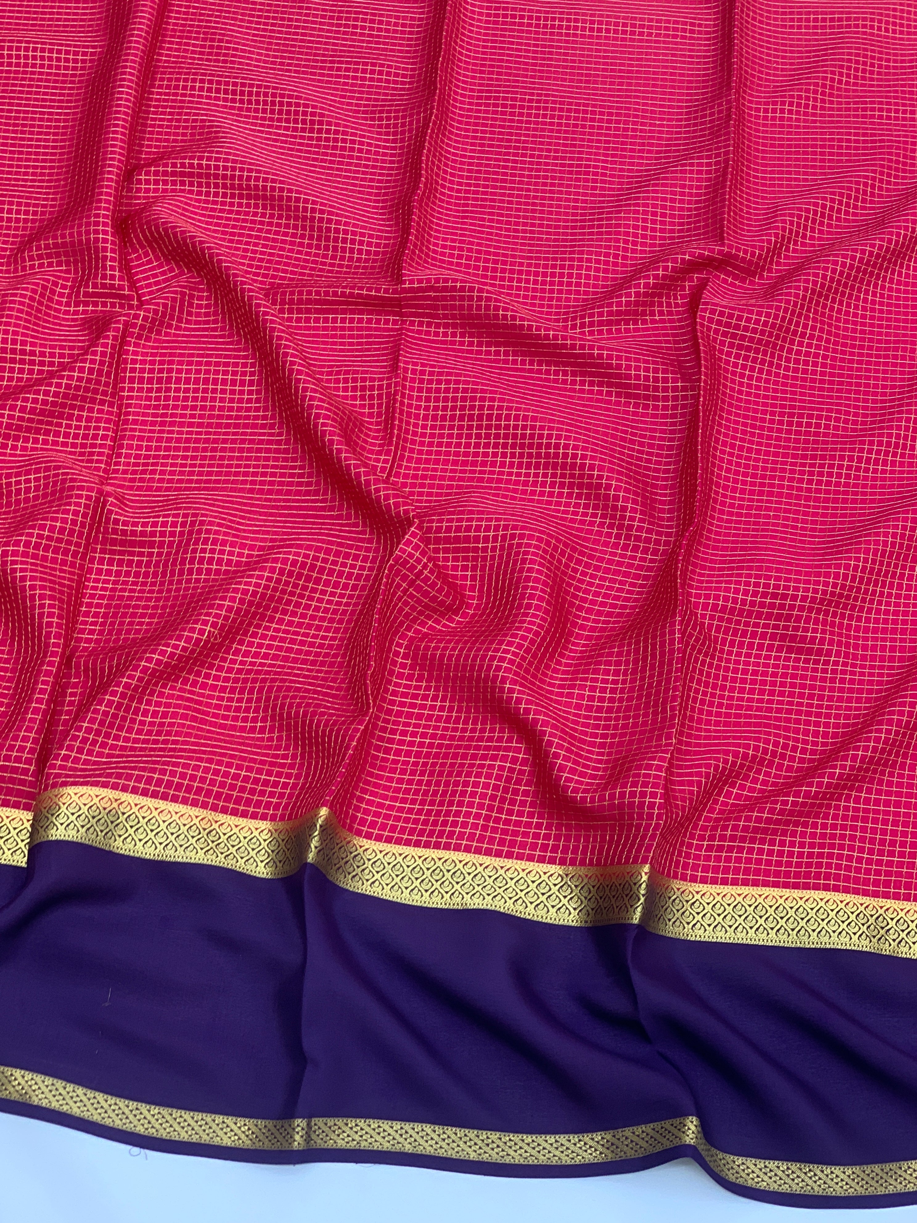Pink mysore silk saree featuring intricate all-over gold zari checks throughout. The saree showcases a striking contrast gap border with striped pallu detailing. Paired with a coordinating plain blouse that has a contrasting border accent. Perfect for traditional occasions and celebrations.