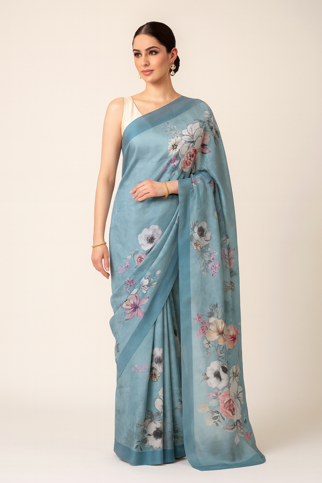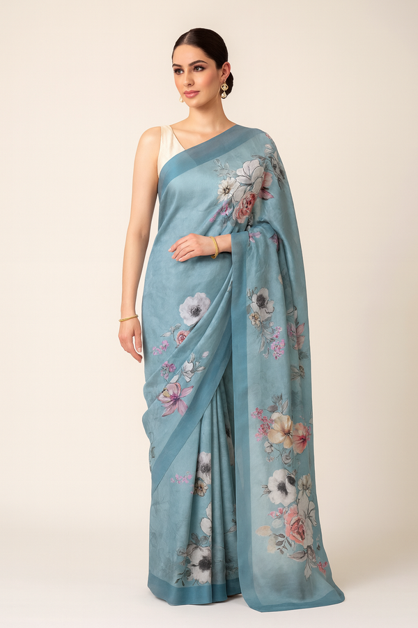 This saree features an all-over floral print design, accented by a subtle plain border in a beautiful light-blue hue. The accompanying blouse is also adorned with a matching floral pattern and crafted from luxurious silk.