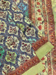 This stunning Organza saree features a checkered pattern with charming floral and geometric designs. The border is adorned with gold zari and the pallu is beautifully printed with florals. The light sea-green color adds a refreshing touch. The blouse is also in a matching color with a self pattern.