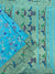 This handwoven paithani saree features a combination of parsi-gara and french-knot work, showcasing a floral design and gold zari checks. The saree is adorned with a self peacock border and pallu in a soft pastel-blue color. The blouse is simple yet elegant, with a zari border to match the saree.