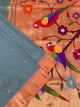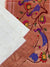 This beautiful paithani silk saree is handwoven with a stunning gold zari polka design throughout the fabric. The saree also features a contrasting tissue triple muniya border and elegant peacock motifs in florals. The half-white color adds to its charm, and the blouse is a simple self plain design with muniya border.