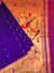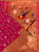 Paithani saree in purple features a self akruthi border and a parrot motif pallu adorned with gold zari polka dot buttis throughout the weave. The accompanying blouse is plain with a border, completing the elegant ensemble.