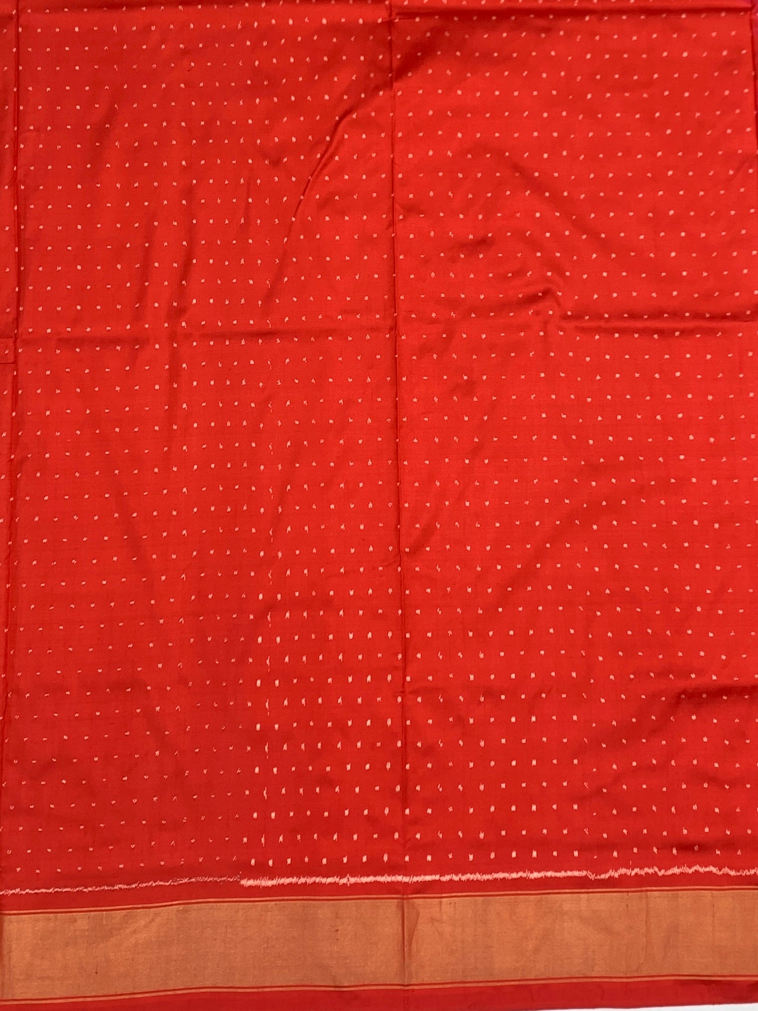 The Border: A sleek, shimmering gold zari border framed by crimson red, providing a clean and luxurious finish.