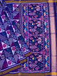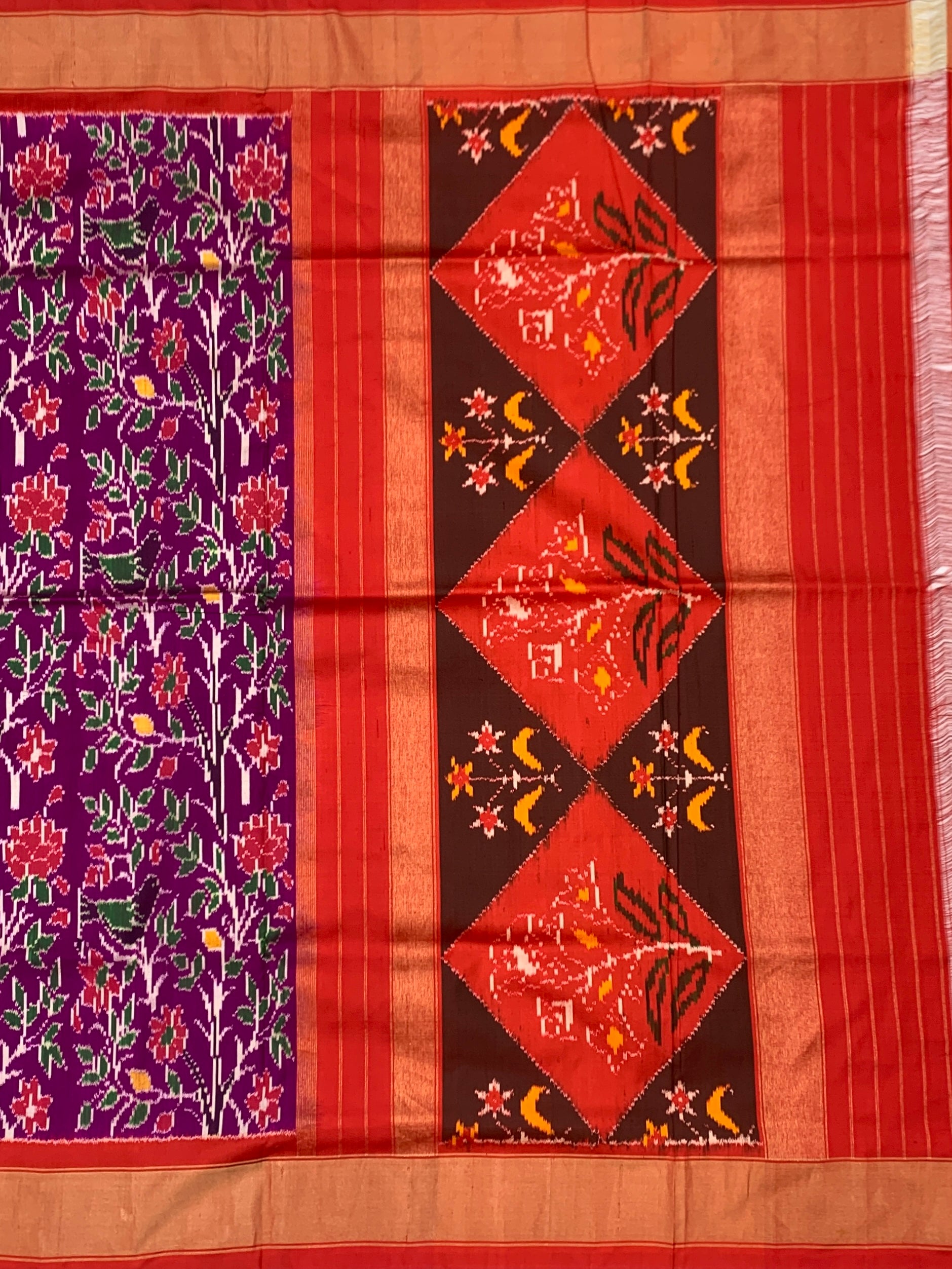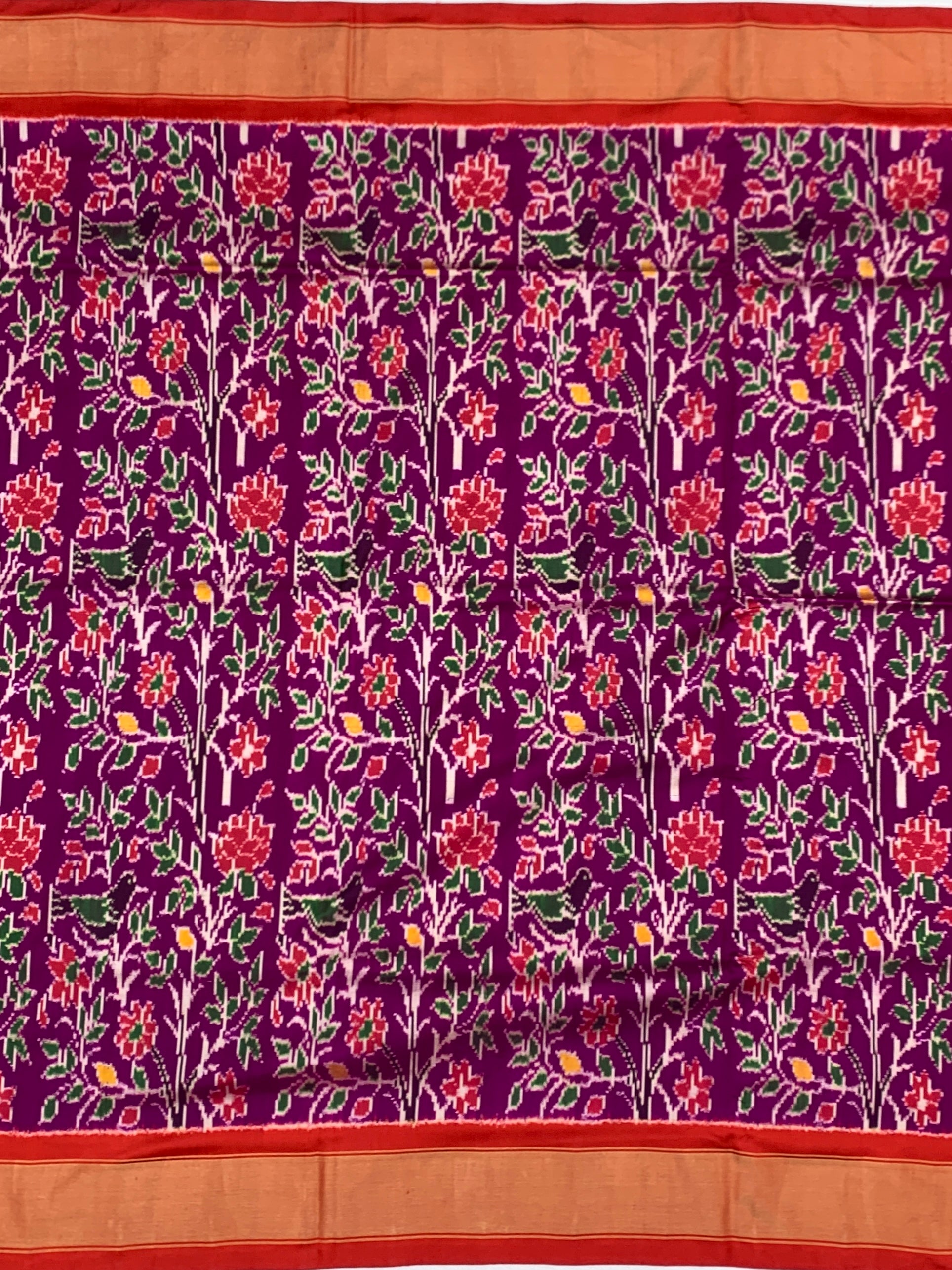 The Body: A lush purple canvas adorned with intricate floral and vine Ikat motifs in shades of crimson, white, and forest green. The dense pattern creates a garden-like effect that is both traditional and sophisticated.