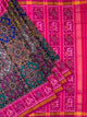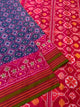 Patola saree features a navratan pattern woven throughout, with a contrasting ganga-jamuna floral, elephant, bird motif border and floral pallu, the blue color is complemented by a secondary yellow color, and the blouse is plain with a matching border.