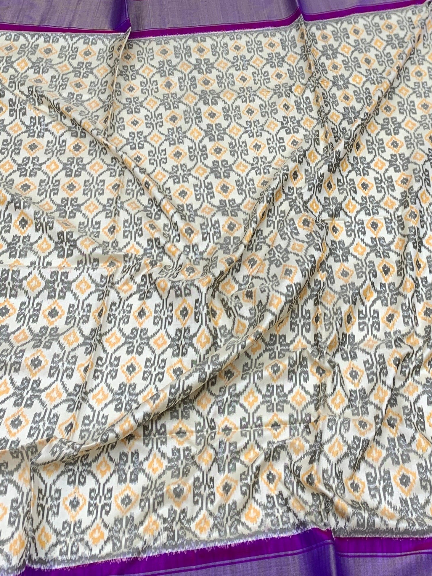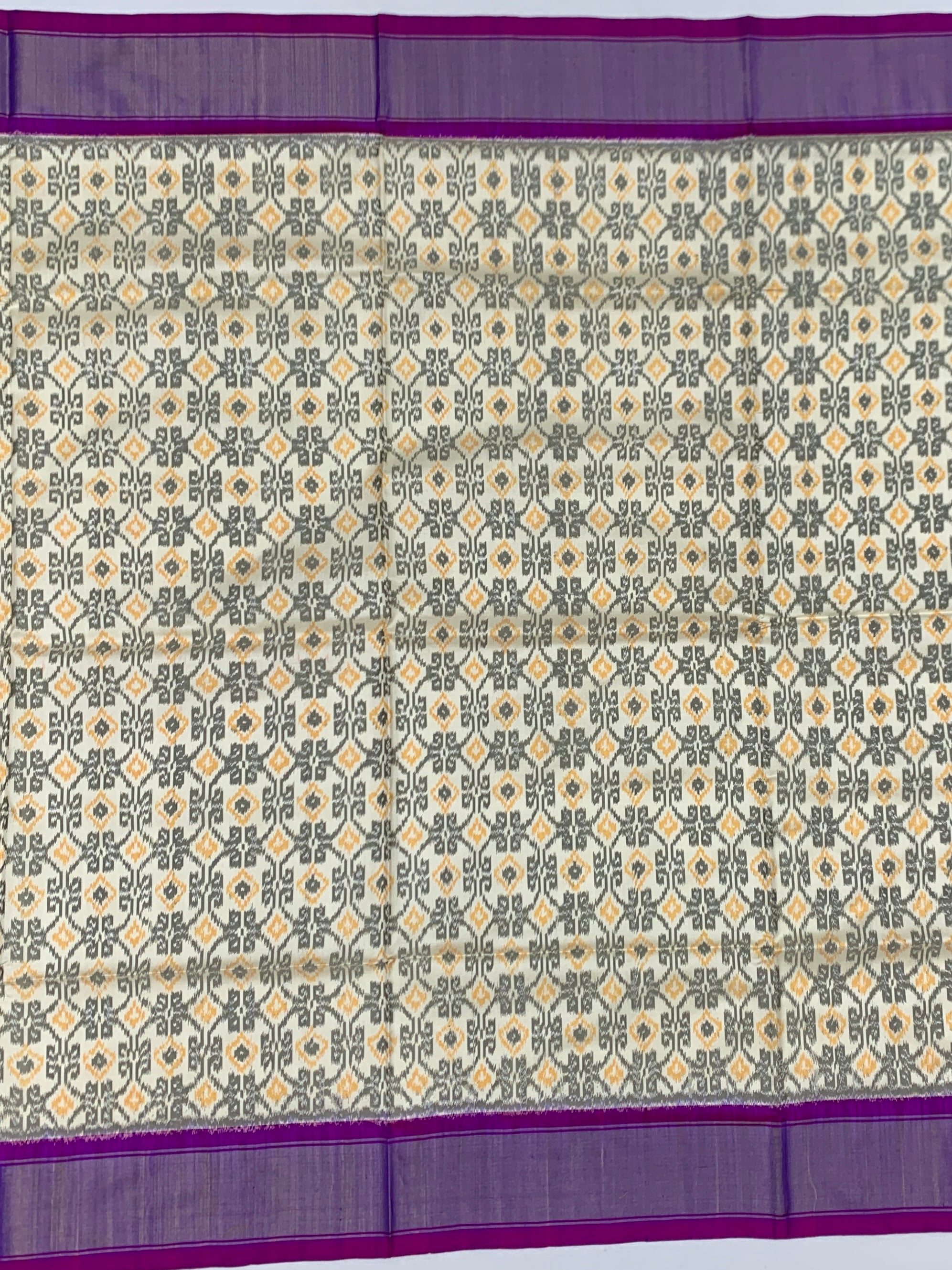 The Body: A clean, off-white base adorned with double Ikat geometric motifs. The repetitive diamond and floral-inspired patterns are rendered in charcoal grey and ochre yellow, creating a modern yet traditional aesthetic.