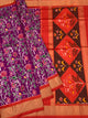 The Pallu: A striking contrast in deep Purple. It features dense, intricate Ikat work with traditional Chakra and diamond patterns that add a sense of luxury and weight to the drape.