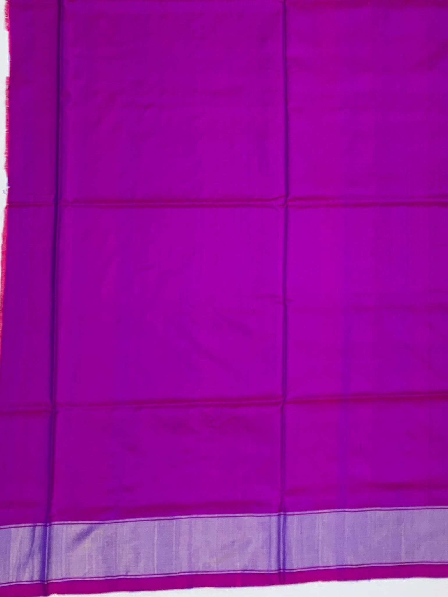 The Border: A solid, dual-tone border in magenta and rich purple, finished with a sleek silver zari line. This adds a crisp, structured frame to the flowing fabric.
