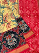 This Kalamkari Kanjeevaram Saree features a unique weave with a multi-colour check pattern and peacock floral design. The saree is accentuated with a traditional brocade border and pallu, adding a touch of contrast. The colour scheme is vibrant and multi-coloured, while the blouse is plain with a zari border.