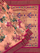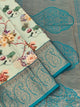 This teal-blue coloured Kanjeevaram printed saree features a beautiful floral design all over the saree, highlighted by a contrasting gold zari gap border and ikat design pallu. The blouse is adorned with a contrasting ikat pattern and zari border, completing the look.