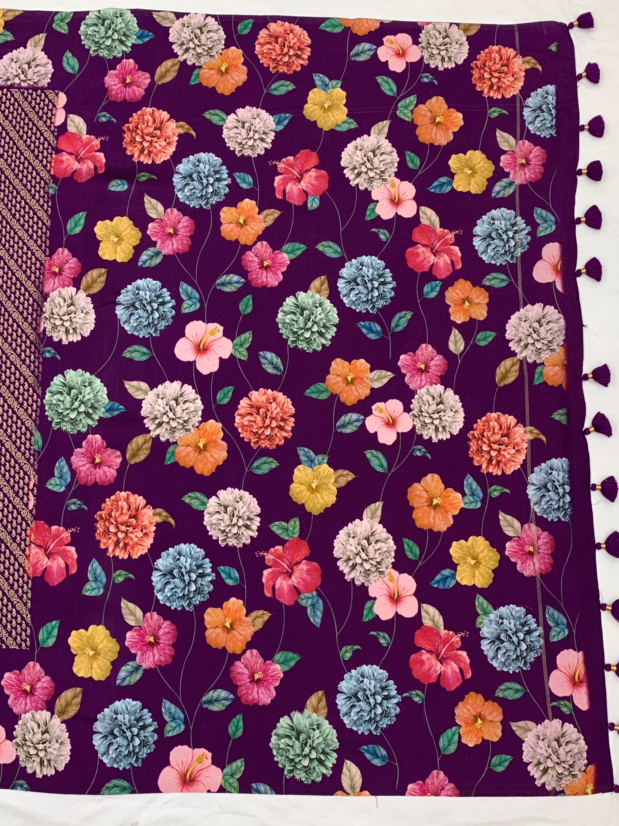 Body : Intricate gold zari leheriya traditional weaving that catches light beautifully Border : Delicate floral printed that frame the saree elegantly Pallu : Matching floral design on the pallu for a cohesive look Color : Rich Purple hue, a sophisticated and versatile shade...