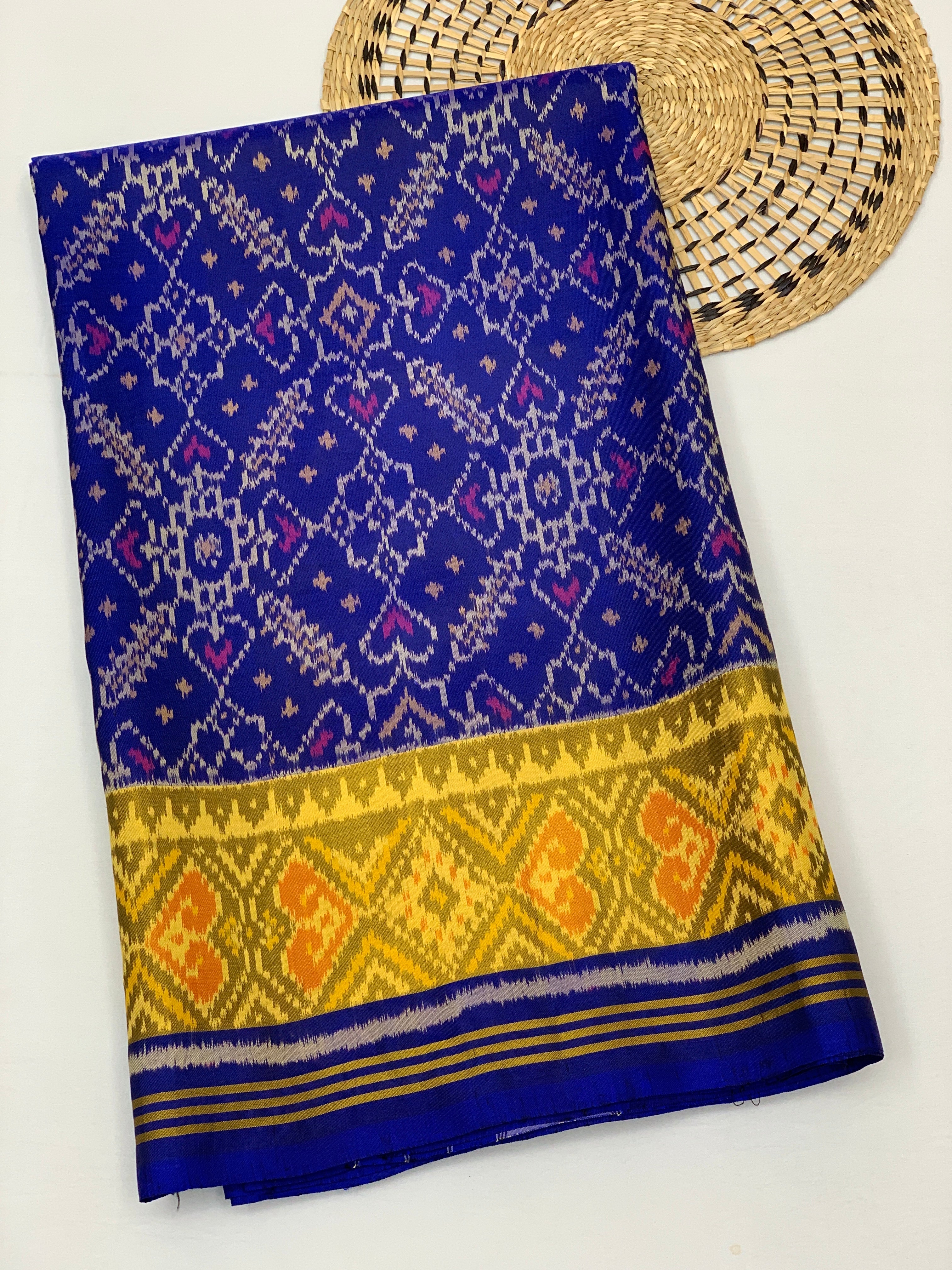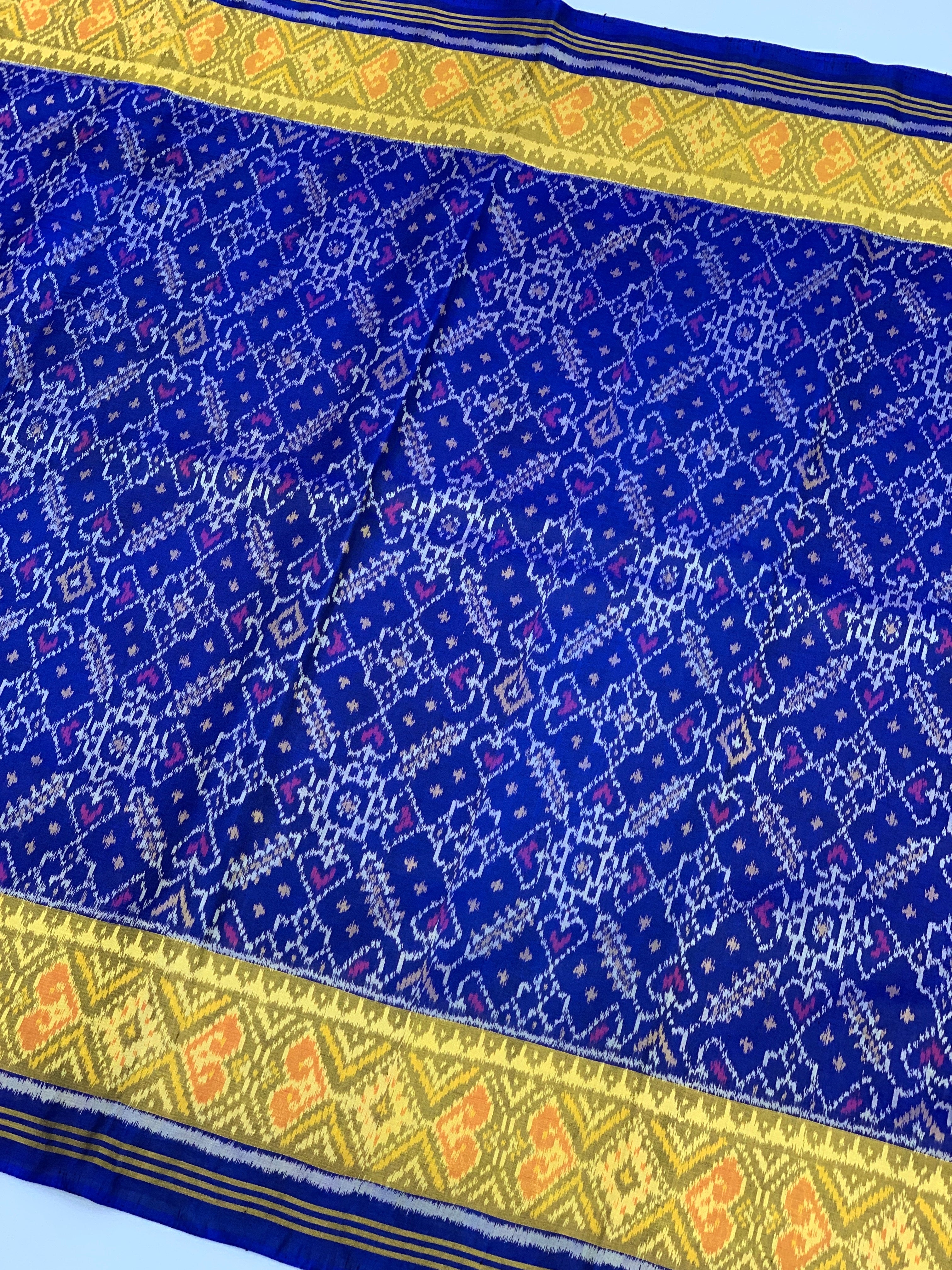 Royal blue rajkot patola saree. The body features a heritage-inspired Navratan design in deep blue, creating a sophisticated contrast against the shimmering vibrancy of a gold zari tissue floral border. The true masterpiece lies in the pallu, where intricate geometric heart and diamond motifs come together to create a mesmerizing visual rhythm. Paired with a self-colored plain blouse with a coordinating border, this drape is a seamless blend of authentic craftsmanship and traditional grandeur. It is the definitive choice for your next wedding or festive celebration.