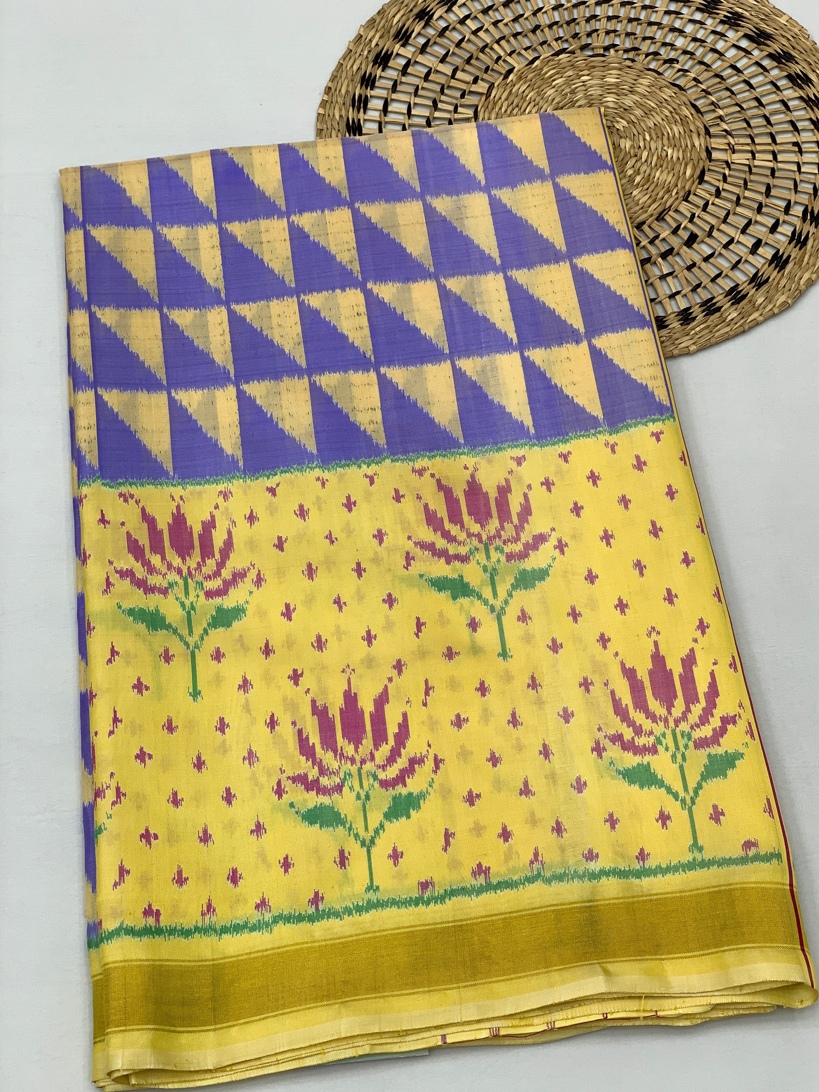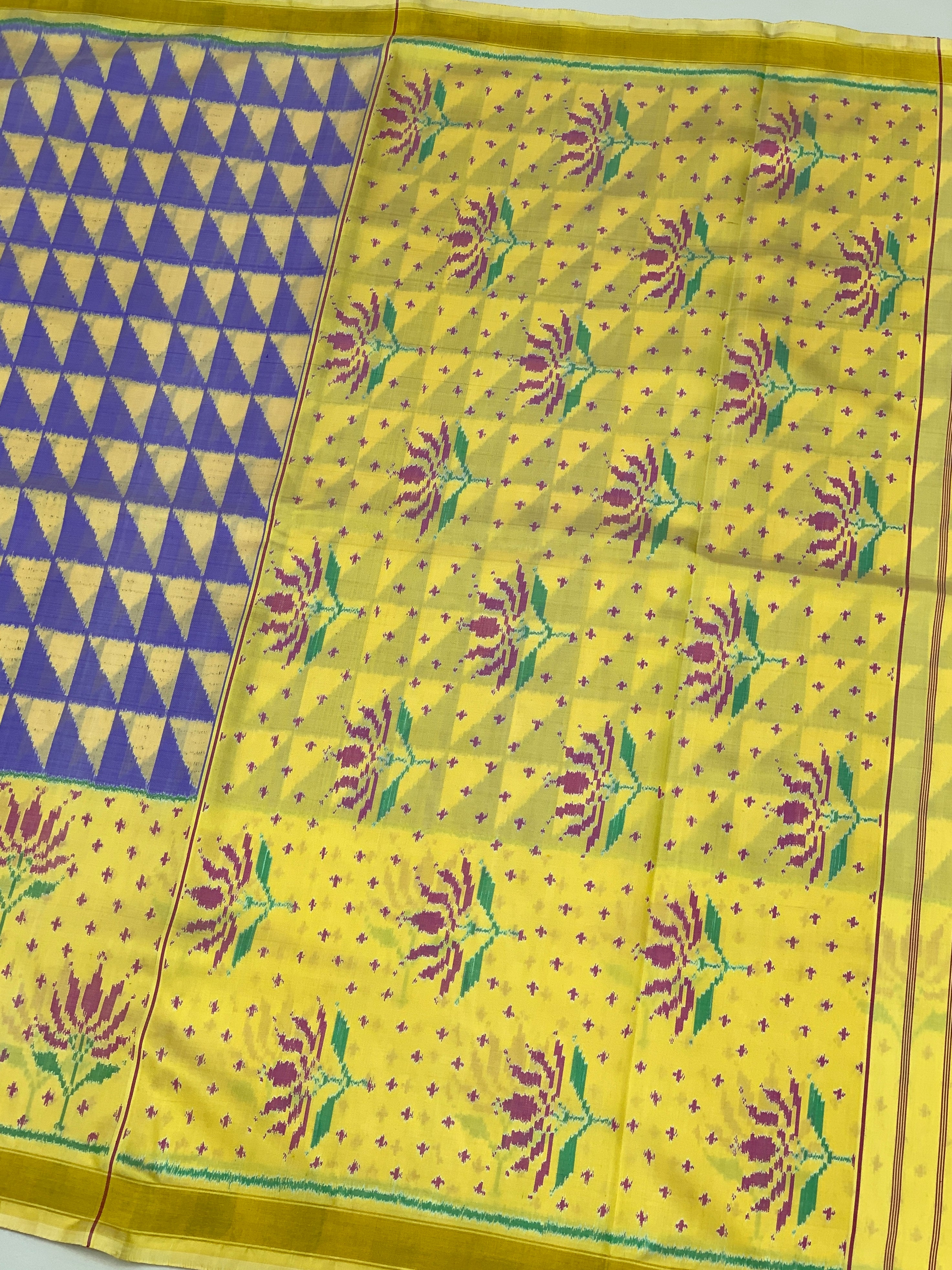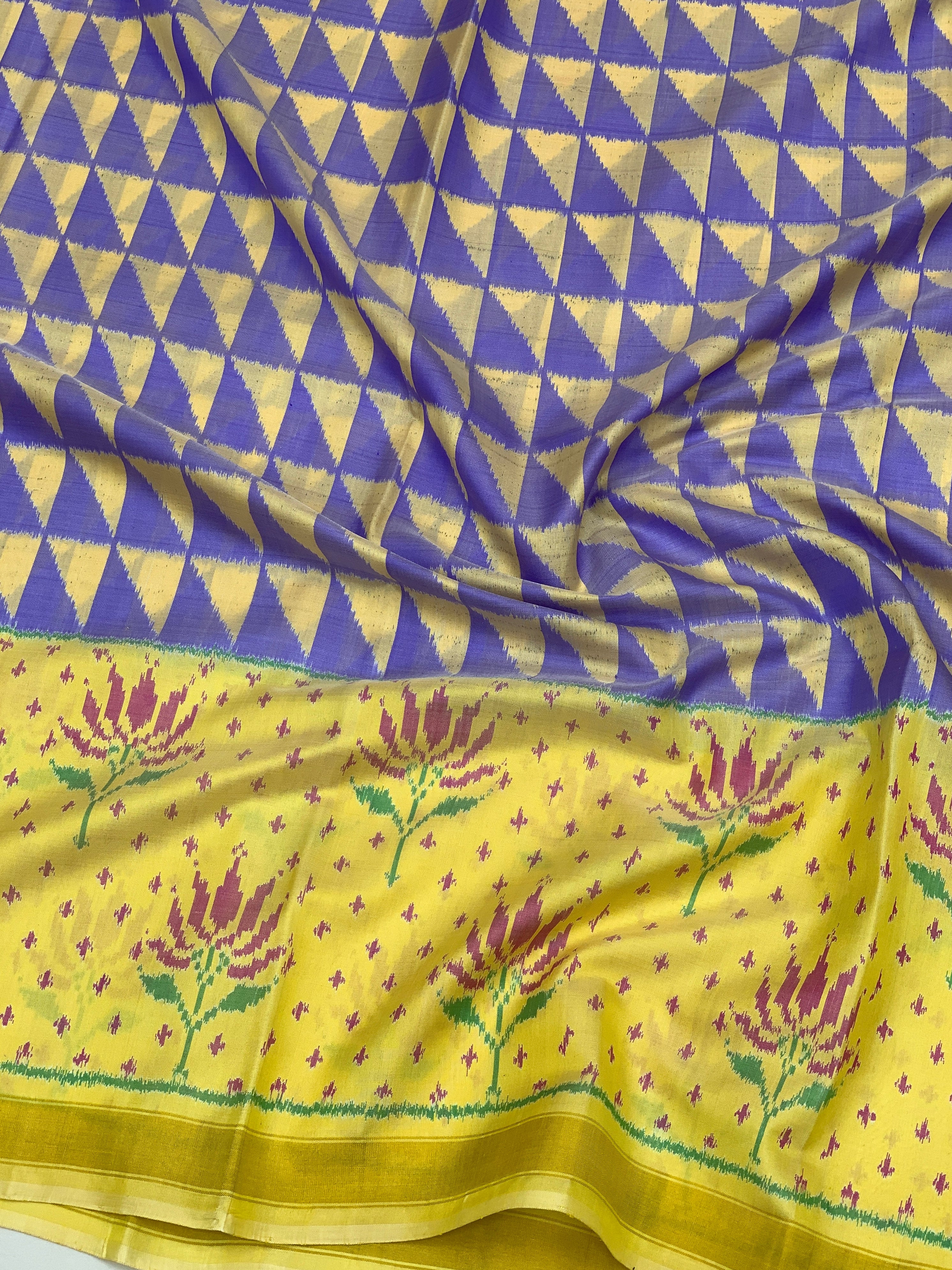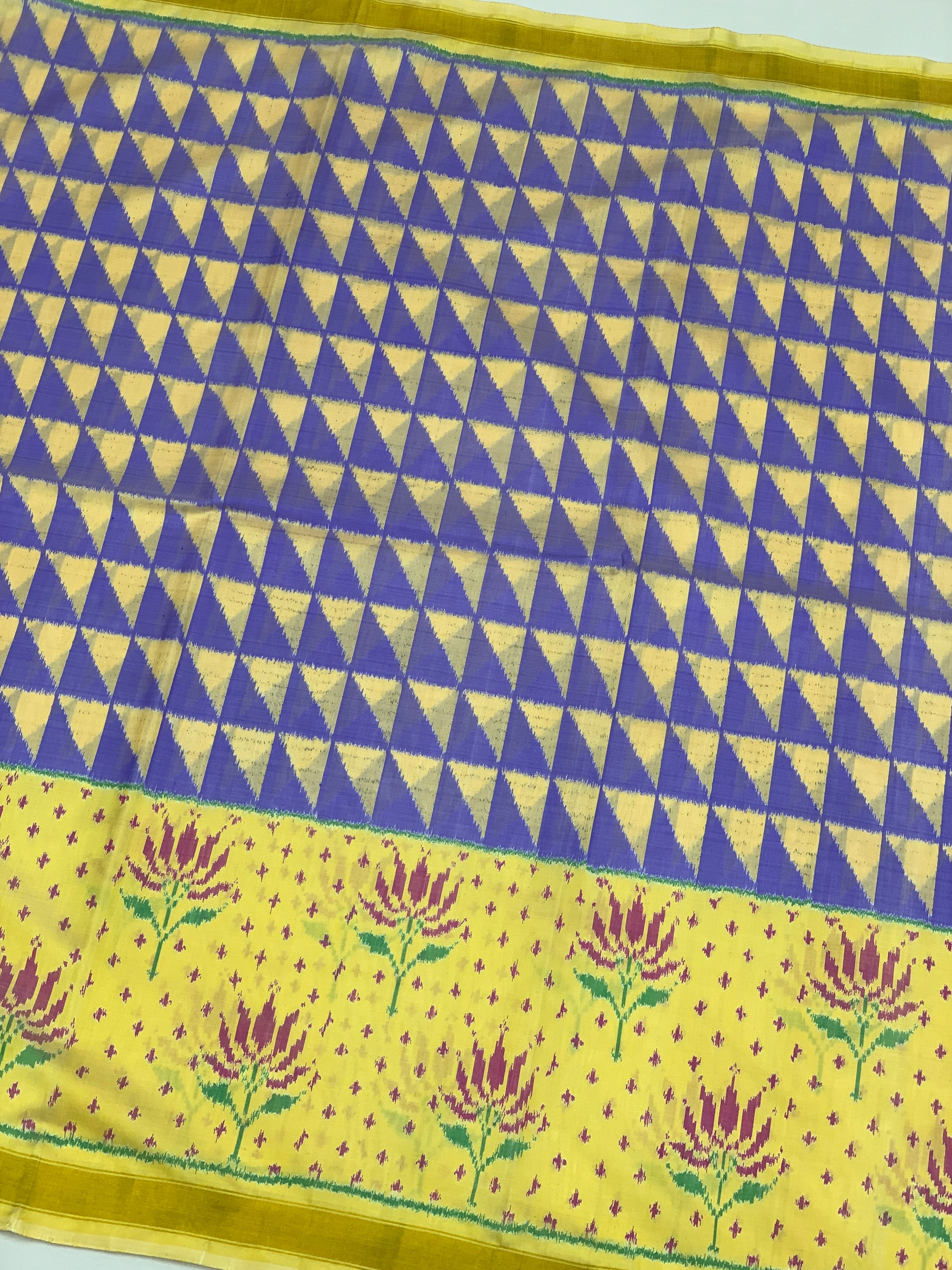 This exquisite Rajkot patola saree showcases the region's renowned weaving mastery with an all-over geometric pattern that exemplifies traditional craftsmanship. The lavender base is beautifully complemented by lemon-green accents, while the contrast floral border and pallu add sophisticated detailing. The accompanying blouse features a plain design with a coordinating border, creating a refined ensemble perfect for discerning patola enthusiasts.