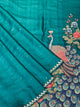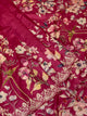 The Tussore Saree in a red color features an intricate weave, showcasing theme motif print and aari-work on the body. The self aari-work scallop border and theme motif pallu add to its elegant design. The accompanying blouse is a simple self pattern with a border, completing the look.