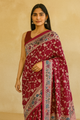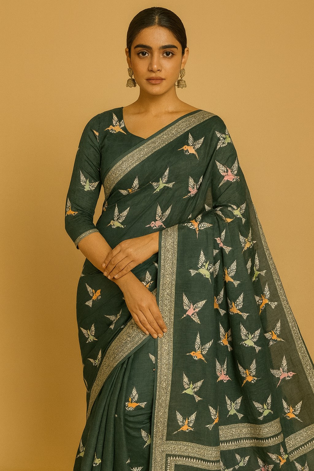 The tussore georgette saree is adorned with intricate gold zari and meenakari birds motif, while featuring a self brocade border and pallu. The elegant dark-green color adds to the overall beauty. The accompanying blouse also boasts self gold zari brocade pattern with border detail.