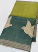 Blue tussore saree, where heritage meets modern luxury. The body is meticulously woven with shimmering gold zari checks, creating a delicate, all-over radiance. The design is anchored by a sophisticated folk-inspired traditional printed border and a matching pallu, This curated ensemble includes a coordinating blouse piece featuring delicate print for a seamless, polished look.