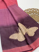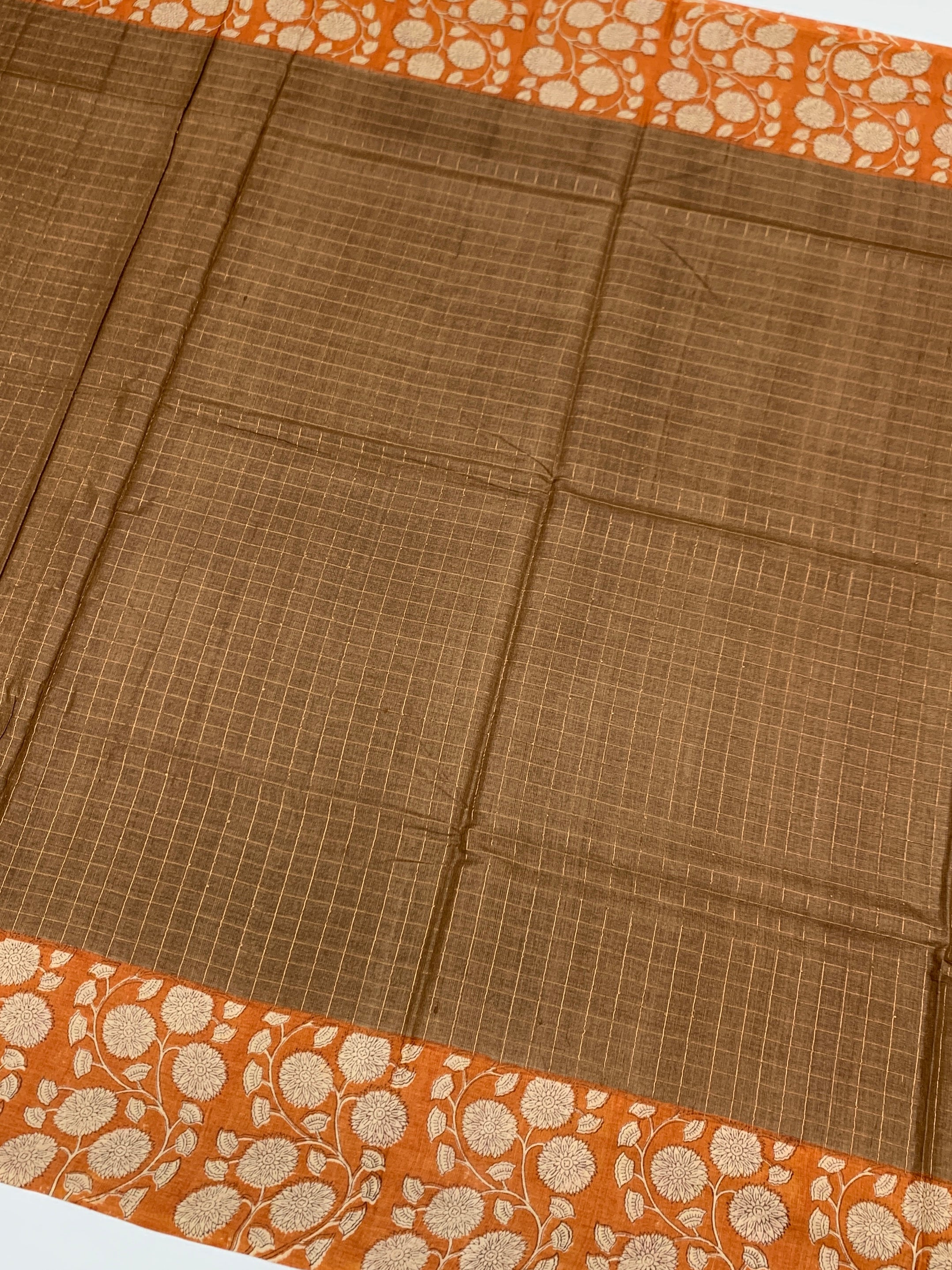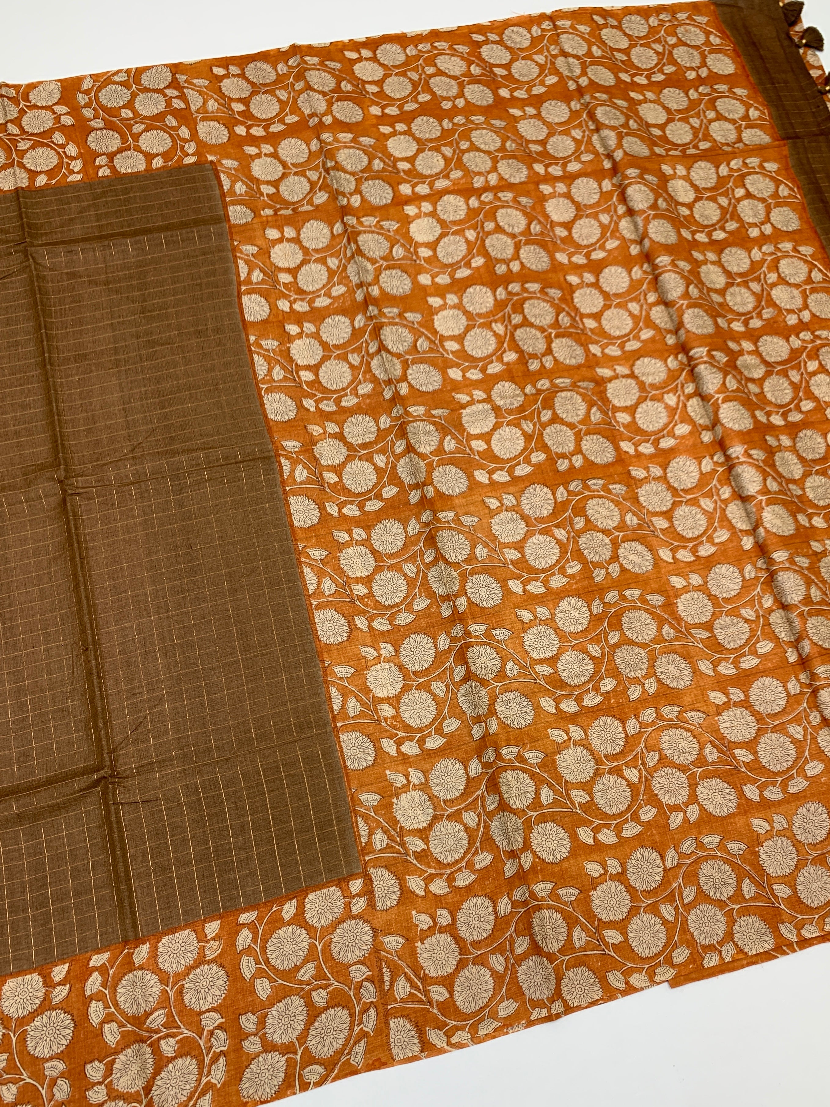 Exquisite brown tussore saree. The body is intricately woven with shimmering gold zari checks, offering a subtle sparkle throughout. It features a sophisticated contrast-floral printed border and a matching pallu that blends traditional texture with contemporary design. This ensemble is completed with a coordinating blouse piece adorned with delicate floral printed.